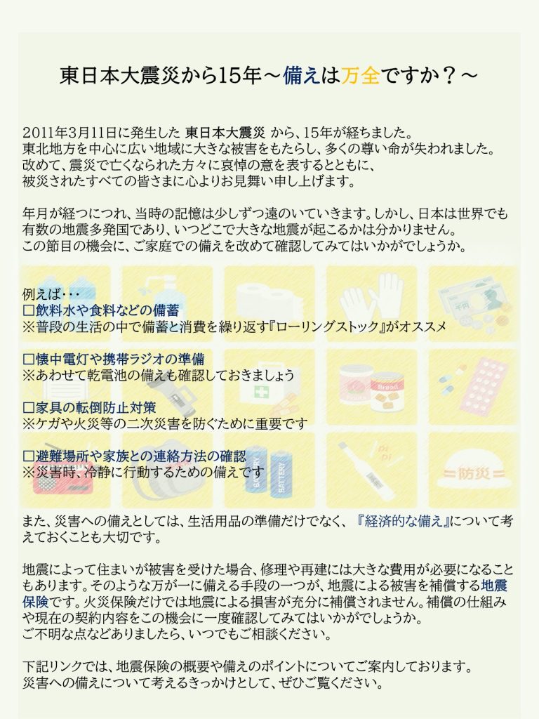 東日本大震災から15年~備えは万全ですか?~ 2026.03.13 ユナイテッド通信 備えて安心 地震保険の話【jishin202511.pdf】 出典:一般社団法人 日本損害保険協会『備えて安心 地震保険の話』 一覧に戻る