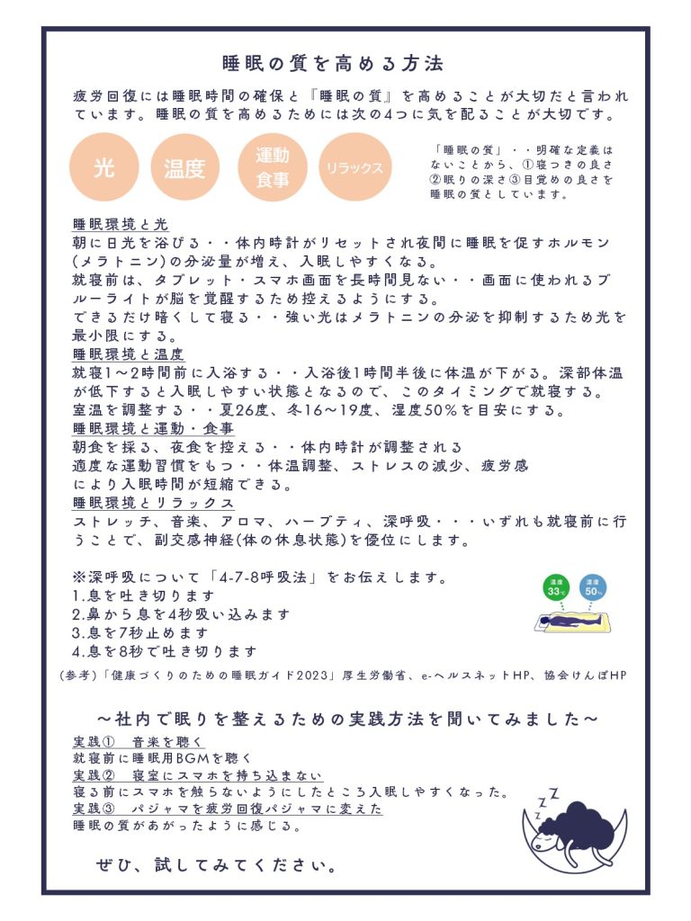 睡眠の質を高める方法 2026.03.27 ユナイテッド通信 新しい季節の始まりは、心や体に気づかない負担がかかるもの。春先は眠りが浅くなりやすい時期でもあります。 毎日を心地よく過ごすために、睡眠の質を整えるヒントを分かりやすくお届けします。 一覧に戻る
